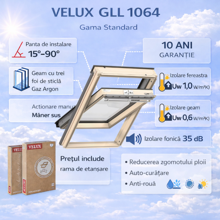 Fereastra VELUX GLL 1064 este alegerea ideala pentru mansarde locuite, oferind un echilibru excelent intre pret si performanta, datorita geamului triplu si caracteristicilor tehnice superioare.